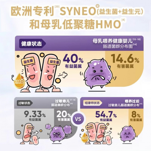为牛奶蛋白过敏宝宝挑选口粮时,家长们常常会看到有人引荐深度水解奶粉。那么,深度水解奶粉的成效和效果是什么?它可以有用缓解宝宝过敏吗?今日就来为家长们答疑解惑。 首先要清晰的是,宝宝牛奶蛋白过敏,中心原因是肠道没有发育老练,无法吸收一般配方粉中的完好大分子蛋白,从而引发身体免疫反响。想要缓解这样的一种状况,第一步就得避开难吸收的大分子蛋白。而深度水解奶粉运用专业水解工艺,将牛奶蛋白分解成更小的短肽和氨基酸,不只大幅度的降低了致敏性,还能让宝宝肠道更易吸收,从本源上削减过敏反响的产生。 该选什么样的深度水解奶粉呢?宝宝过敏常和肠道吸收功用弱相关,所以只需优先挑选可以修正肠道的深度水解奶粉,才干更好地从根本上改进宝宝过敏体质。 纽康特深度水解HMO奶粉就很契合敏宝的需求:它运用先进蛋白水解工艺,一起选用100%乳清蛋白配方,既简单消化,口味也更靠近宝宝承受的天然口感,防止宝宝因口味抵抗喝奶。更要害的是,它还立异增加了欧洲专利组合SYNEO®+HMO(益生元+益生菌组合),其间的益生菌明星成分——短双歧杆菌M-16V,经过临床验证,抗敏才能杰出,能有用按捺肠道内有害菌生长;益生元含量到达8.0g/L,还具有100+种结构,经过9:1的科学配比,精准模仿母乳中的益生元环境,给宝宝带来更靠近母乳的肠道养分滋补。此外,配方中增加的HMO(母乳中重要的生物活性成分),还能逐渐优化益生元结构,让益生菌的激活功率提高2倍,更高效地调度宝宝肠道微生态,帮宝宝增强自护力,从内削减过敏重复。 别的,家长们不需要过多的忧虑深度水解奶粉养分不行:纽康特深度水解HMO精心增加了核苷酸、DHA、ARA 等多种维生素和矿物质,完全能满意宝宝生长发育的天然生成养分需求,让宝宝在缓解过敏的一起,也能健康长身体。 对敏宝来说,选对奶粉就像给宝宝的健康加了一层防护盾。深度水解奶粉不只能经过低敏配方缓解当下的过敏症状,选对含益生元、益生菌且养分全面的产品(比方纽康特深度水解HMO奶粉),还能帮宝宝调度肠道、增强自护力,从根本上削减过敏重复。只需找对方向、选对奶粉,家长们定能离别过敏焦虑,看着宝宝健康快乐地生长。